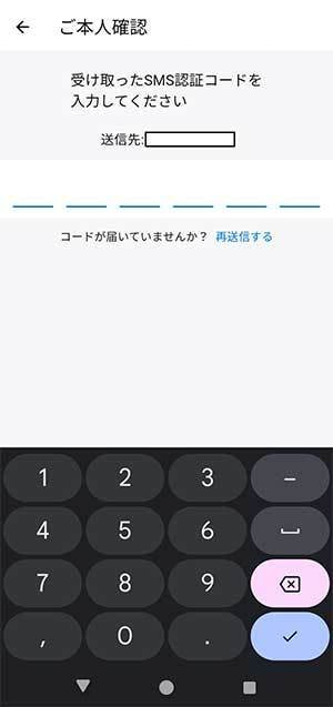 ショートメール(SMS)に届いた6桁の数字を入力します