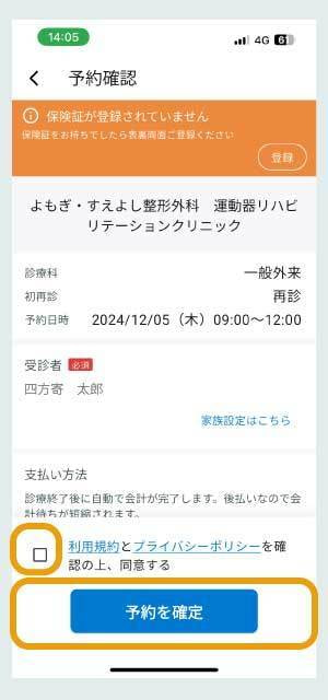 予約内容をご確認いただき、間違いがなければ「利用規約とプライバシーポリシーを確認の上、同意する」をチェックしていただき、「予約を確定」ボタンを押してください。